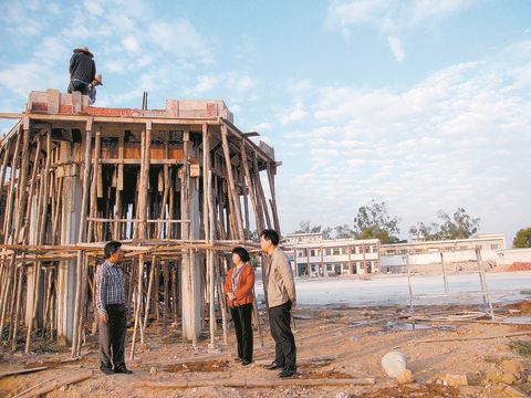 葵潭農(nóng)場(chǎng)黨委書記鐘惠明(中)、場(chǎng)長(zhǎng)林慶忠(右)在場(chǎng)部社區(qū)文化廣場(chǎng)建設(shè)工地檢查工作。